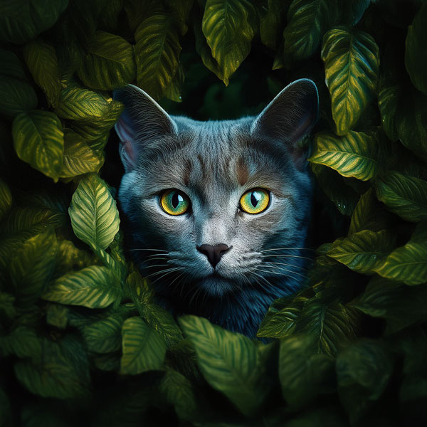 Samt / Velours-Panel "Russisch Blau" Katze in Blätter